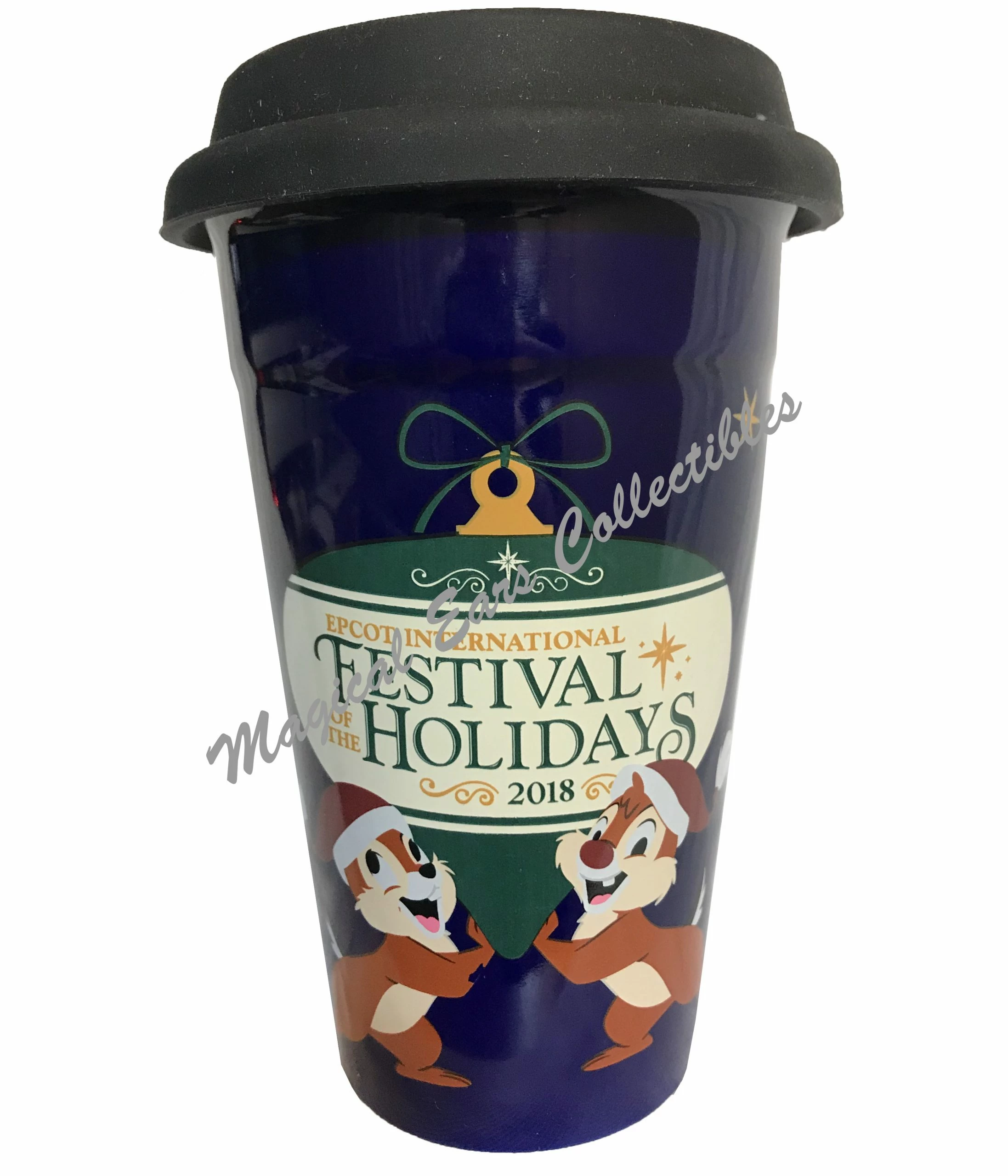 This Ceramic Travel Tumbler is from the 2018 Epcot International Festival of the Holiday, Features Festival of the Holiday Logo.